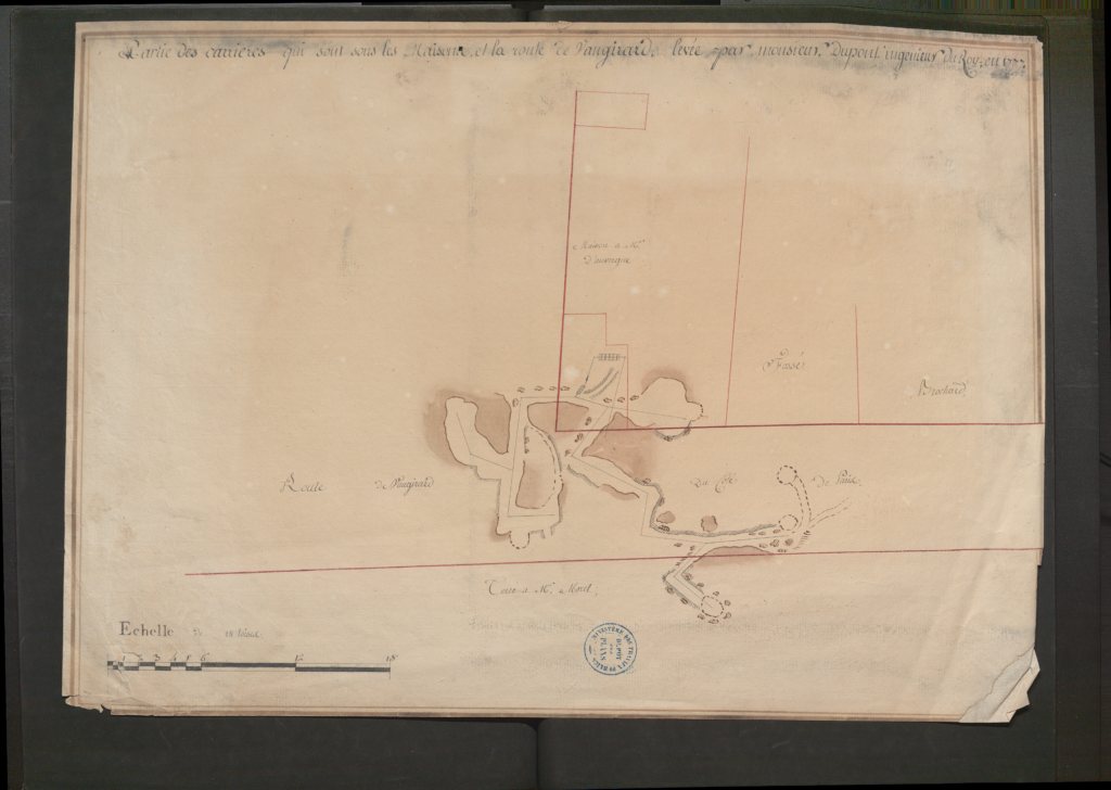 Nous avons parcouru dans tous ces endroits qui menacent des dangers dans toute la plaine alentour, nous fumes chez un nommé Terroir, M[aitre] vacher, riche occupant de la ferme de Saint Jean de Latran, nous avons trouvé un atelier sous le sieur Terroir où l’on scie de la pierre. Le grain y était encore tout frais, nous avons cherché pour où cette pierre pouvait être tirée. Nous avons trouvé le puits du sieur Terroir à trente pieds de là et la route la plus fréquentée. Tous les piliers de ces cantons et tout ce qui reste de pierre sont de très bon liais. Tout est affaiblis aux environs de la maison du Sieur Terroir.
